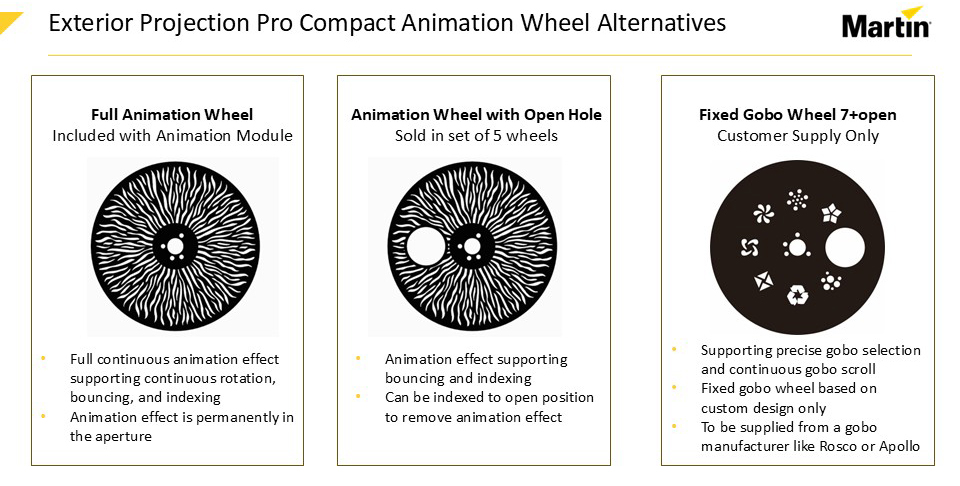 Explore Exterior Projection Pro Compact’s Animation Wheel Effects First is a continuous animation effect with rotation, bouncing, and indexing; a second uses gobos with and without animation via an open position in the wheel; and third, it is possible to replace the animation wheel with a custom fixed gobo wheel with up to seven designs plus open—ideal for multiple breakup patterns or in combination with the rotating gobos. MORE